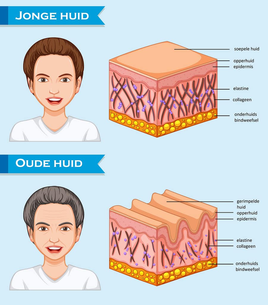 Doordat de collageen- en elastine vezels dikker en losser worden, wordt de huid minder elastisch. Met rimpels en verzakking van de huid tot gevolg