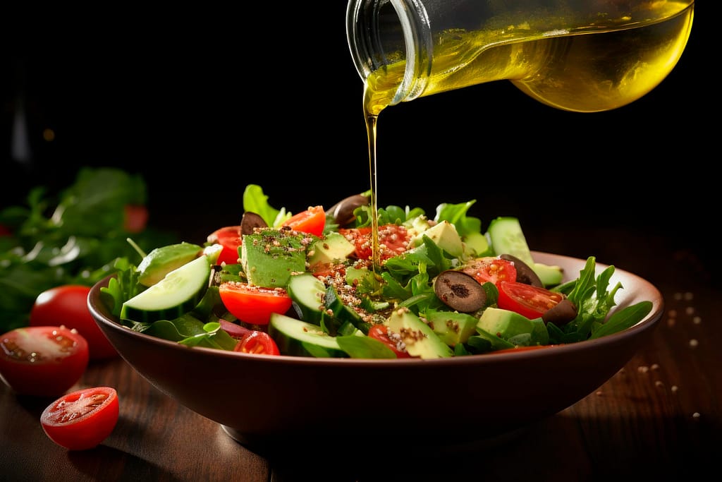 Olijfolie kan op veel manieren in je dieet worden opgenomen. Je kunt het gebruiken in saladedressings of als dipsaus.